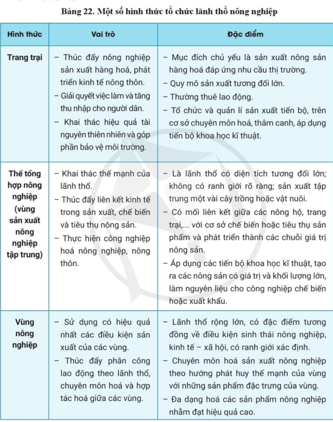 – Đọc thông tin trong mục “Một số hình thức tổ chức lãnh thổ nông nghiệp” và quan sát bảng 22.