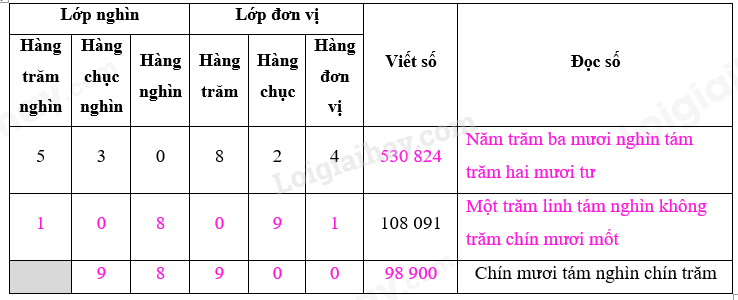 – Viết số theo từng lớp, lần lượt từ hàng trăm nghìn, hàng chục nghìn, hàng nghìn, hàng trăm, hàng chục, hàng đơn vị