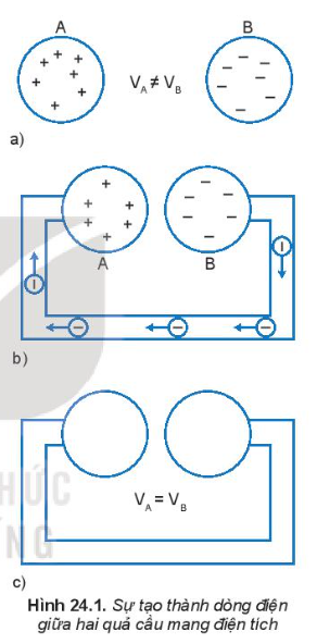 Tại sao dòng điện trong trường hợp mô tả ở Hình 24.1 chỉ tồn tại trong khoảng thời gian rất ngắn? Làm thế nào để duy trì dòng điện trong trường hợp này lâu dài?