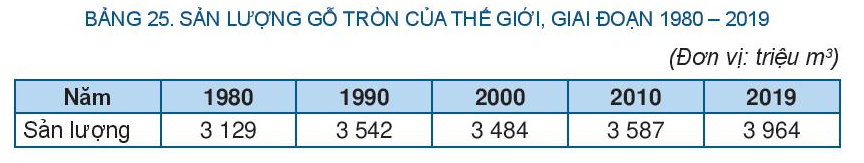 + Giai đoạn 1980 – 2019, sản lượng khai thác gỗ trên thế giới có sự biến động: xu hướng tăng trong giai đoạn 1980 – 1990 (tăng 413 triệu m3), xu hướng giảm trong giai đoạn 1990 – 2000 (giảm 58 triệu m3), sau năm 2000 có xu hướng tăng trở lại.