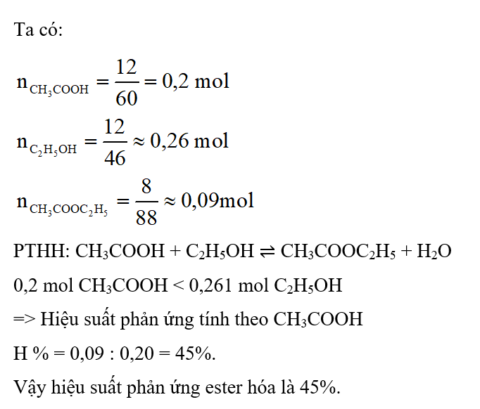 Cho 12 g acetic acid phản ứng với 12 g ethanol (có H2SO4 đặc làm xúc tác) thu được 8 g ester. Tính hiệu suất phản ứng ester hoá.