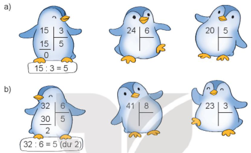 Tính. Cách chia táo của bạn nào cho ta phép chia hết ? Chọn số dư của mỗi phép chia dưới đây. Rô-bốt chia 56 con cá vào các rổ, mỗi rổ 8 con cá.