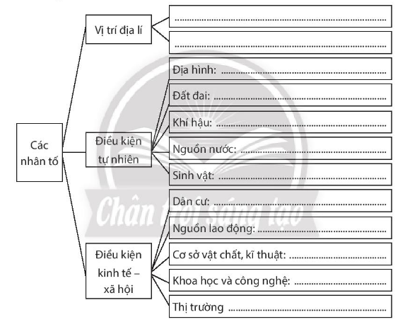 Dựa vào kiến thức đã học, em hãy hoàn thành sơ đồ các nhân tố ảnh hưởng tới phát triển và phân bố nông nghiệp, lâm nghiệp, thủy sản dưới đây