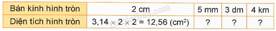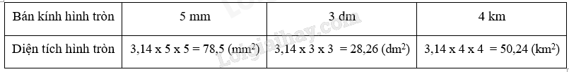 b) Muốn tính diện tích hình tròn ta lấy số 3,14 nhân với bán kính rồi nhân với bán kính: