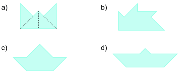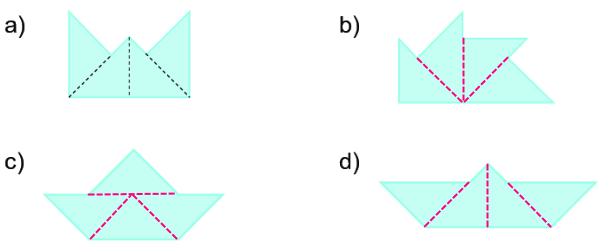 Dùng bốn hình tam giác vừa cắt được để xếp thành mỗi hình theo các đường nét đứt dưới đây: