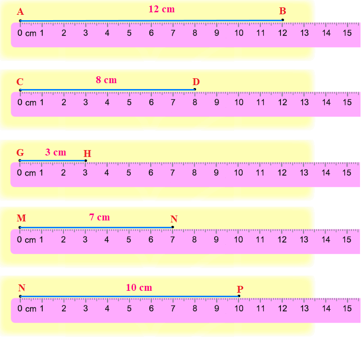 Độ dài các đoạn thẳng AB, CD, GH, MN, NP như sau:
