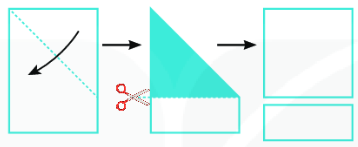 Quan sát hình vẽ rồi thực hành gấp rồi cắt tờ giấy hình chữ nhật thành một hình vuông và một hình chữ nhật theo mẫu đã cho.