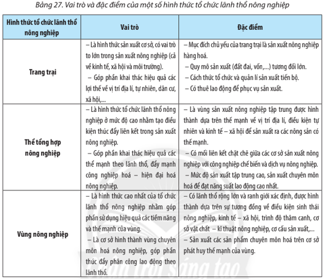 Dựa vào bảng 27, thông tin trong bài và những hiểu biết của bản thân, em hãy phân biệt vai trò, đặc điểm của một số hình thức tổ chức lãnh thổ nông nghiệp.