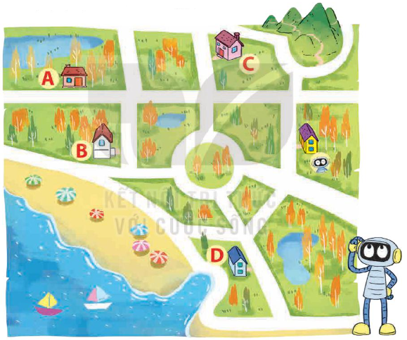 Cho hình vẽ dưới đây. Biết Rô-bốt ở ngôi nhà màu vàng. Nhà của Mai và nhà của Rô-bốt ở hai đường song song với nhau. Hỏi trong các ngôi nhà A, B, C, D, đâu là nhà của Mai?