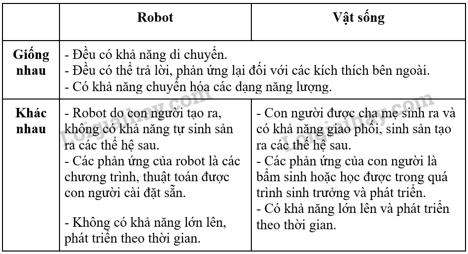 Một con robot cũng có khả năng di chuyển, tương tác với môi trường xung quanh, thậm chí trả lời các câu hỏi và đưa ra lời khuyên hữu ích cho các bác sĩ trong việc điều trị bệnh. Con robot có đặc điểm nào giống và khác với vật sống.