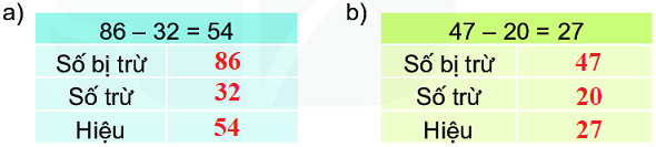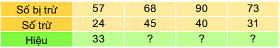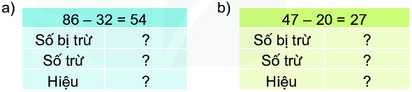 Xem lại lí thuyết về số bị trừ, số trừ, hiệu để tìm mỗi số đó trong phép tính.