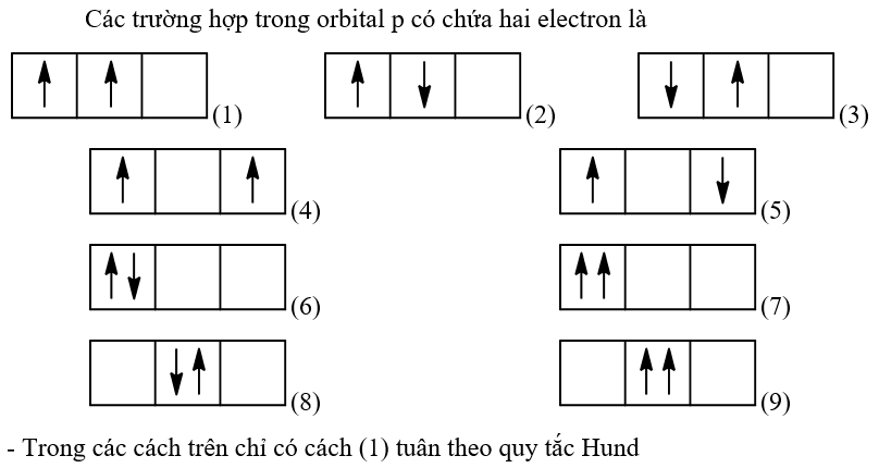 Trường hợp trong orbital p có chứa hai electron thì có những cách nào biểu diễn electron trong orbital đó? Cách nào tuân theo quy tắc Hund?