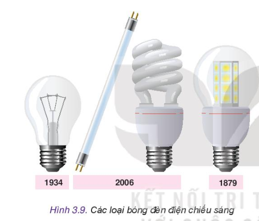 Quan sát hình 3.9 và sắp xếp loại mốc thời gian đánh dấu sự phát triển của công nghệ điện – quang. Hãy gọi tên từng loại bóng đèn có trong hình