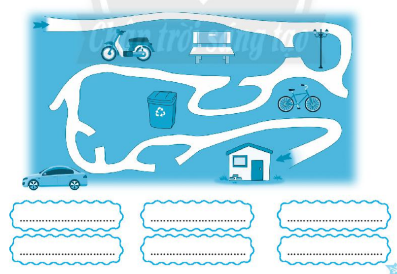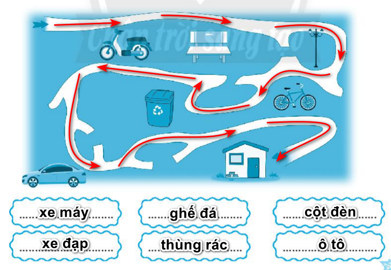 Em quan sát hình và tô màu vào đường về nhà, viết tên những vật trên đường.