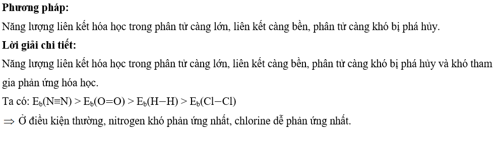 Câu hỏi 5: Dựa vào giá trị năng lượng liên kết (Eb), hãy dự đoán ở điều kiện thường, chất nào (nitrogen, hydrogen, oxygen, chlorine) khó và dễ tham gia phản ứng hoá học nhất. Vì sao?