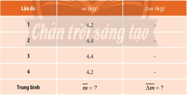 \(\begin{array}{l}\Delta {m_1} = \left| {\overline m  – {m_1}} \right| = \left| {4,3 – 4,2} \right| = 0,1(kg)\\\Delta {m_2} = \left| {\overline m  – {m_2}} \right| = \left| {4,3 – 4,4} \right| = 0,1(kg)\\\Delta {m_3} = \left| {\overline m  – {m_3}} \right| = \left| {4,3 – 4,4} \right| = 0,1(kg)\\\Delta {m_4} = \left| {\overline m  – {m_4}} \right| = \left| {4,3 – 4,2} \right| = 0,1(kg)\end{array}\)