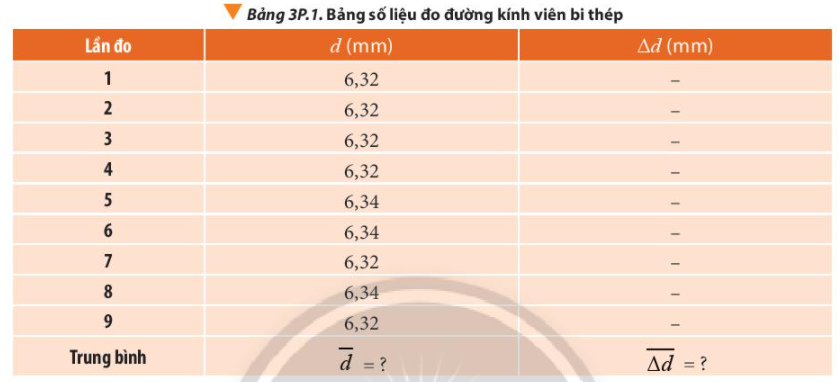 2. Bảng 3P.1 thể hiện kết quả đo đường kính của một viên bi thép bằng thước kẹp có sai số dụng cụ là 0,02 mm. Tính sai số tuyệt đối và biểu diễn kết quả phép đo có kèm theo sai số.