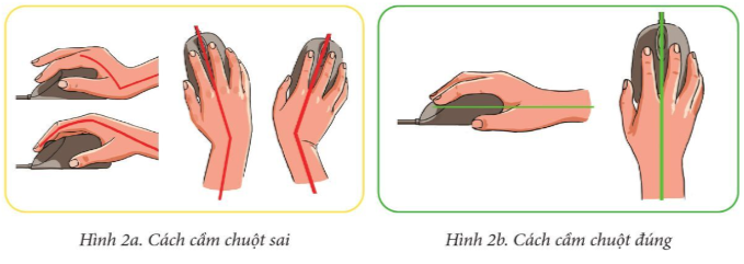 Em hãy quan sát Hình 2a và 2b. Từ đó, nói cho bạn biết cách cầm chuột như thế nào là đúng và như thế nào là sai?