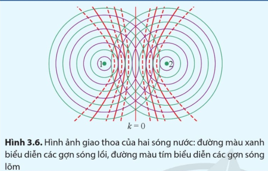 Dùng bút chì vẽ đường nối các điểm giao nhau giữa các gợn lồi hoặc của các gợn lõm của hai nguồn sóng trên Hình 3.6 và đối chiếu kết quả với công thức (3.1).