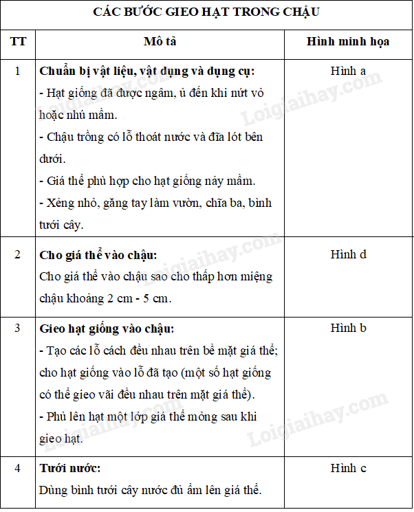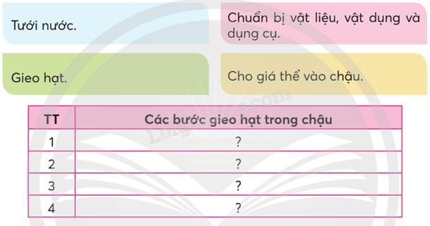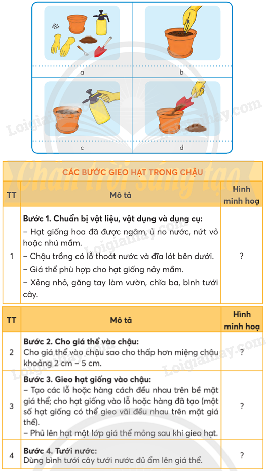 Em hãy sắp xếp các bước gieo hạt trong chậu được mô tả dưới đây theo thứ tự hợp lí.