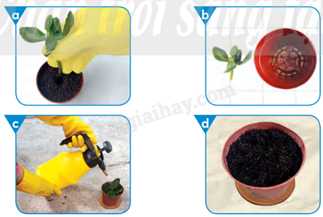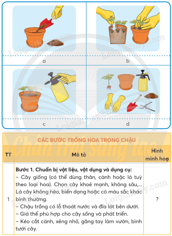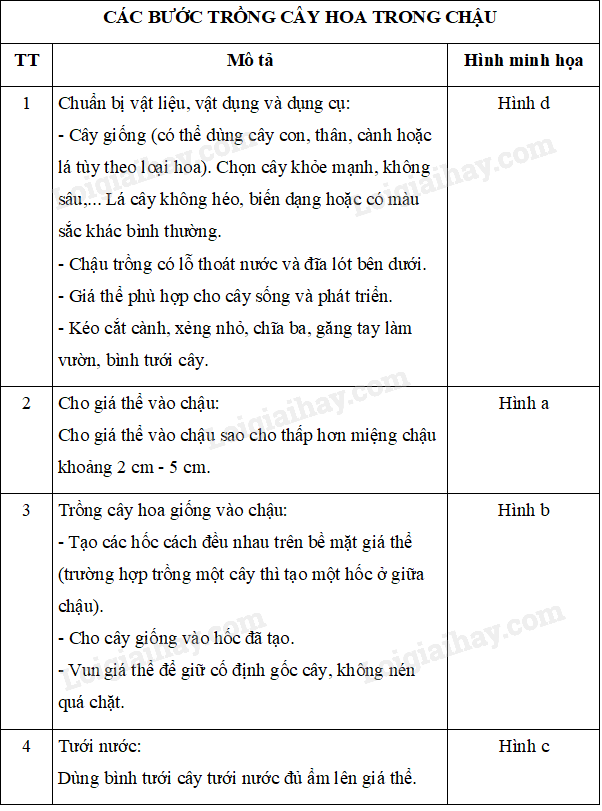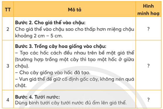 Em hãy cho biết thứ tự đúng của các bước trồng cây hoa trong chậu có trong hình dưới đây và nêu tên các bước tương ứng.