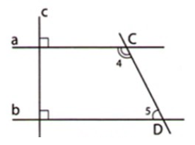 Vì \(a//b\,\,(cmt)\) nên \(\widehat {{C_4}} + \widehat {{D_5}} = {180^o}\) (hai góc trong cùng phía bù nhau)     (1)