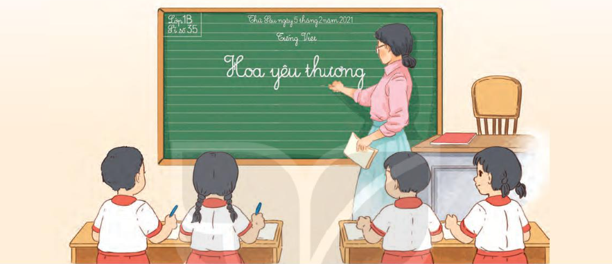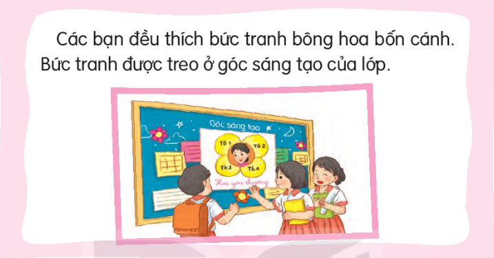 Quan sát tranh. Nói về việc làm của cô giáo trong tranh. Nói về thầy giáo hoặc cô giáo của em. Đọc. Lớp của bạn nhỏ có mấy tổ. Bức tranh bông hoa bốn cánh được đặt tên là gì. Theo em, có thể đặt tên nào khác cho bức tranh. Viết vào vở câu trả lời cho câu hỏi c ở mục 3. Chọn từ ngữ để hoàn thiện câu và viết câu vào vở. Quan sát tranh và dùng từ ngữ trong khung để nói theo tranh. Nghe viết. Chọn chữ phù hợp thay cho bông hoa. Vẽ một bức tranh về lớp em (lớp học, thầy cô, bạn bè,…) và đặt tên cho b