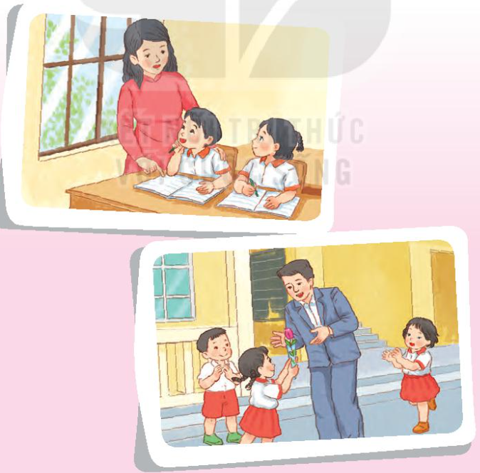 – Chúng em tặng hoa chúc mừng thầy giáo.