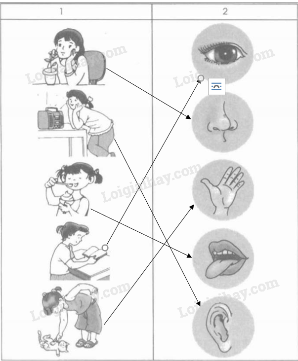 Em hãy quan sát các hoạt động bên cột số 1 và xem các hoạt động đó em dùng giác quan gì: Chúng ta giác quan gì để ngửi mùi thơm bông hoa? Dùng giác quan gì để nghe tin tức tivi? ….