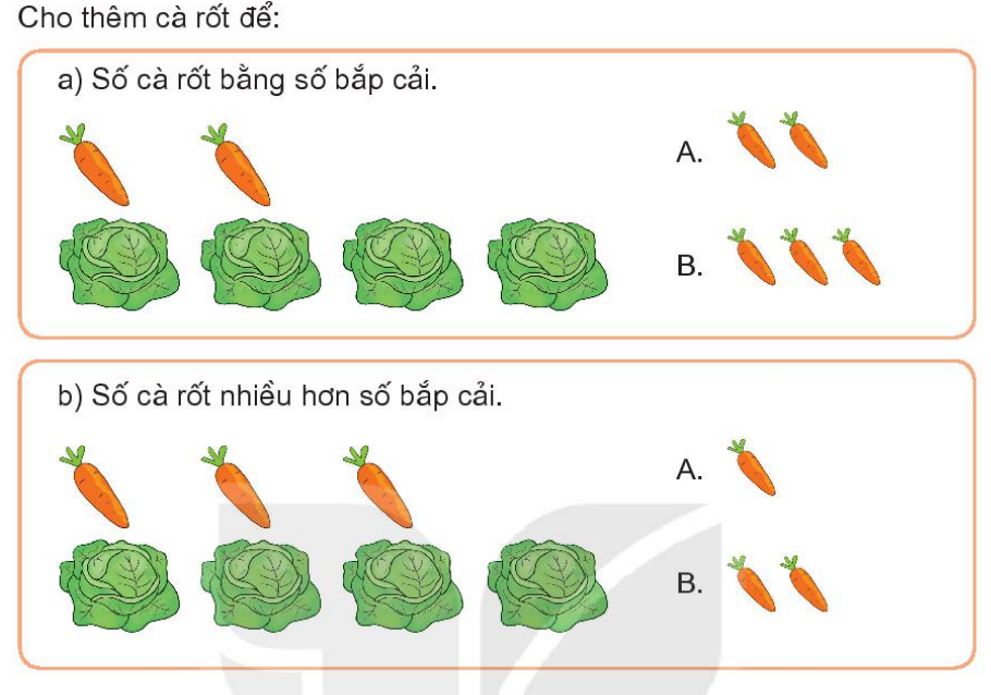 Đếm số cà rốt trong mỗi bức tranh rồi chọn đáp án đúng.