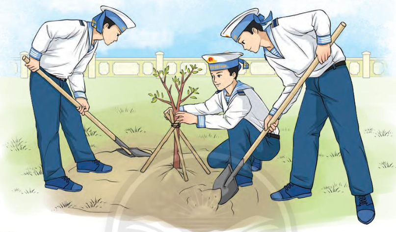Tranh 2: Bức tranh vẽ các chú hải quân. Họ đang tưới cây.