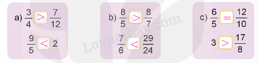 a) $\frac{{31}}{{29}} > 1$ (Phân số $\frac{{31}}{{29}}$ có tử số lớn hơn mẫu số)