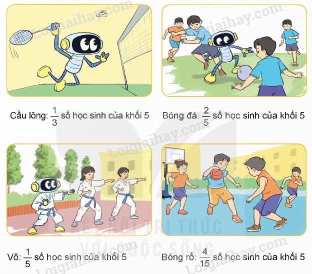 Viết rồi đọc phân số chỉ số phần đã tô màu của mỗi hình dưới đây: Cho biết số học sinh khối 5 tham gia các môn thể thao ở Câu lạc bộ thể thao của Trường Tiểu học Kim Đồng như sau: