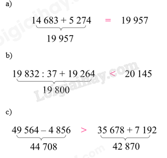 Tính giá trị của từng vế, so sánh rồi điền dấu thích hợp.