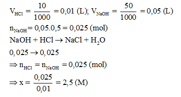 Để trung hoà 10 mL dung dịch HCl nồng độ x M cần 50 mL dung dịch NaOH 0,5 M. Xác định giá trị của x.
