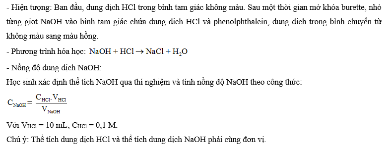 Chuẩn bị: Dung dịch HCl 0,1 M, dung dịch NaOH (chưa biết chính xác nồng độ, khoảng 0,1 M), phenolphatalein, burette, bình tam giác 100 mL.