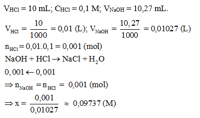 Giả sử khi kết thúc chuẩn độ, thể tích dung dịch NaOH (tính trung bình sau 3 lần chuẩn độ) đã sử dụng ở burette là 10,27 mL. Tính nồng độ của dung dịch NaOH.