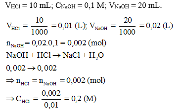 Để xác định nồng độ của một dung dịch HCl, người ta đã tiến hành chuẩn độ bằng dung dịch NaOH 0,1 M. Để chuẩn độ 10 mL dung dịch HCl này cần 20 mL dung dịch NaOH. Xác định nồng độ của dung dịch HCl trên.