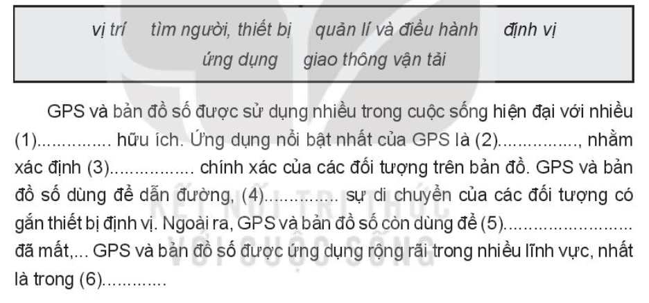 GPS và bản đồ số dùng để dẫn đường, quản lí và điều hành sự di chuyển của các đối tượng gắn thiết bị định vị với các chức năng: xác định điểm cần đến, quãng đường di chuyển, các cung đường có thể sử dụng; quản lí, giám sát, lưu giữ lộ trình đường đi của đối tượng (phương tiện giao thông, các cơn bão,…); tính số ki-lô-mét đã di chuyển và cước phí cho xe buýt, xe khách, xe taxi, xe ôm công nghệ,…;  chống trộm cho các phương tiện. Từ phân tích này có thể thấy GPS và bản đồ số được ứng dụng rộng rãi trong các lĩnh vực: giao thông vận tải, quân sự, khí tượng,..