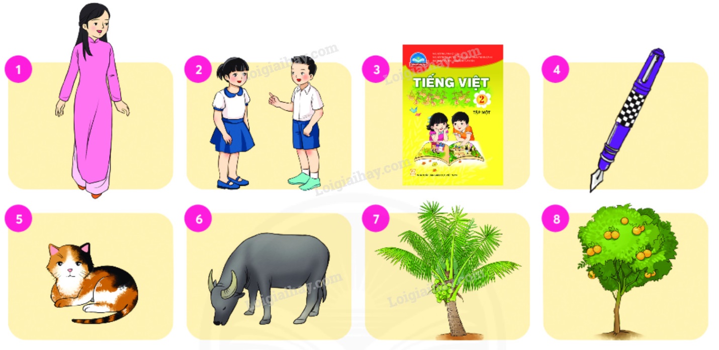 Câu 3: Tìm từ chỉ sự vật (người, đồ vật, con vật cây cối,…) phù hợp với từng tranh.