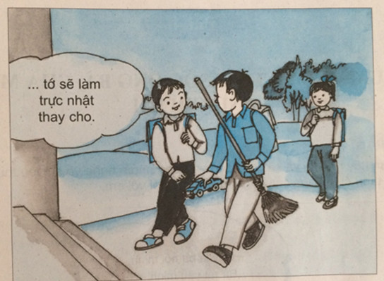 Tình huống 2: Hôm nay, đến phiên Xuân làm trực nhật lớp. Tú bảo: “Nếu cậu cho tớ mượn chiếc ô tô đồ chơi của cậu thì tớ sẽ làm trực nhật thay cho”