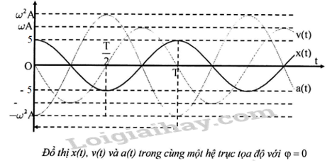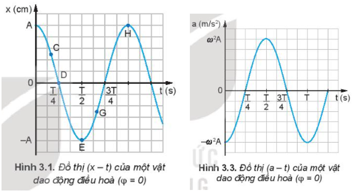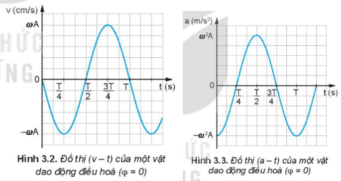 1. Trên đồ thị (v – t) Hình 3.2, tại thời điểm T/4, 3T/4 độ dốc của đồ thị bằng 0 và tại thời điểm 0, T/2, T độ dốc của đồ thị cực đại. Trên đồ thị (a – t) Hình 3.3 thì ngược lại.