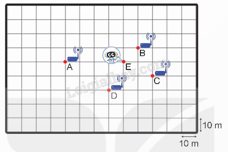 Hỏi Rô-bốt đứng ở vị trí E có thể nhận được sóng từ bộ phát sóng nào?
