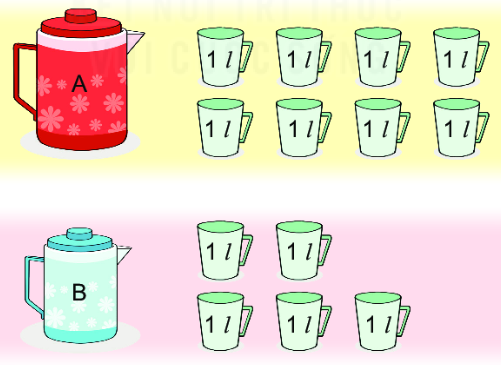 Có hai bình chứa đầy nước. Bạn Mai đã rót hết nước ở bình A sang đầy các ca 1 \(l\) thì được 8 ca, rót hết nước ở bình B sang đầy các ca 1 \(l\) thì được 5 ca.