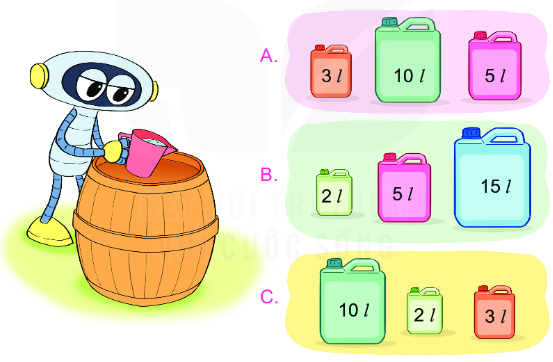 Tính tổng số lít nước ở mỗi đáp án A, B, C rồi so sánh tổng số lít nước đó với 15 \(l\), từ đó chọn được đáp án đúng.