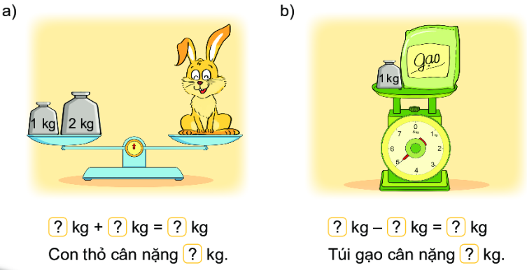 a) Quan sát cân, đọc số đo ki-lô-gam mỗi quả cân ở trên cân đĩa, sau đó để tính cân nặng con thỏ ta tính tổng cân nặng của 2 quả cân trên đĩa cân.