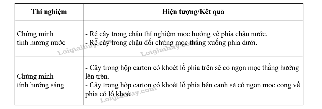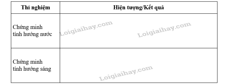 Hoàn thành bảng ghi kết quả thí nghiệm chứng minh tính hướng nước và tính hướng sáng của cây