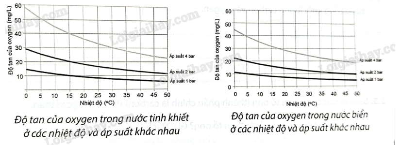 Hai đồ thị sau cho biết độ tan của oxygen trong nước tinh khiết và trong nước biển ở các nhiệt độ và áp suất khác nhau