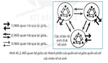 Trong quần xã sinh vật, luôn có các mối quan hệ qua lại giữa các cá thể trong quần thể, giữa các quần thể với nhau và giữa các quần thể với các nhân tố sinh thái vô sinh (Hình 43.2). Hãy cho biết các mũi tên trong hình bên thể hiện mối quan hệ nào. Lấy ví dụ minh hoạ.