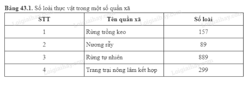 Ở một xã miền núi, người ta chuyển một phần diện tích rừng tự nhiên sang mục đích sử dụng khác. Phân tích Bảng 43.1, hãy nhận xét về sự thay đổi độ đa dạng của quần xã khi có sự chuyển đổi này.